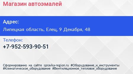 Магазин автоэмалей по адресу Липецкая область, Елец, 9 Декабря, 48 в дальнейшем Организация, размещена в следующих категориях:
