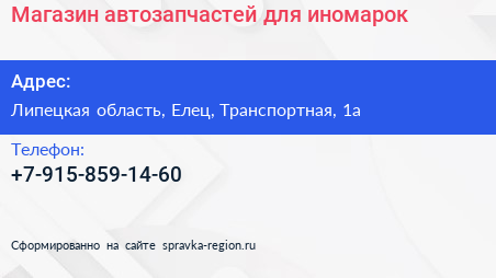 Магазин автозапчастей для иномарок по адресу Липецкая область, Елец, Транспортная, 1а в дальнейшем Организация, размещена в следующих категориях: