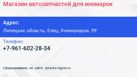 Магазин автозапчастей для иномарок по адресу Липецкая область, Елец, Коммунаров, 99 в дальнейшем Организация, размещена в следующих категориях: