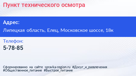 Пункт технического осмотра по адресу Липецкая область, Елец, Московское шоссе, 18к в дальнейшем Организация, размещена в следующих категориях: