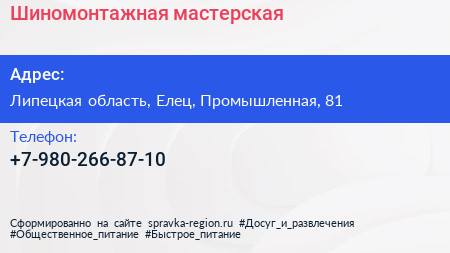 Шиномонтажная мастерская по адресу Липецкая область, Елец, Промышленная, 81 в дальнейшем Организация, размещена в следующих категориях: