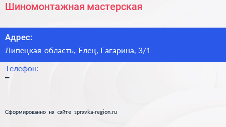 Шиномонтажная мастерская по адресу Липецкая область, Елец, Гагарина, 3/1 в дальнейшем Организация, размещена в следующих категориях: