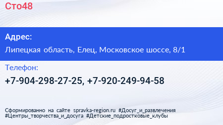 Сто48 по адресу Липецкая область, Елец, Московское шоссе, 8/1 в дальнейшем Организация, размещена в следующих категориях: