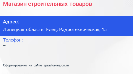 Магазин строительных товаров по адресу Липецкая область, Елец, Радиотехническая, 1а в дальнейшем Организация, размещена в следующих категориях:
