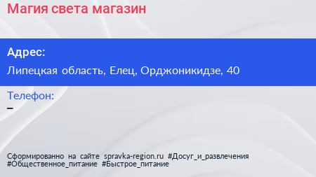 Магия света, магазин по адресу Липецкая область, Елец, Орджоникидзе, 40 в дальнейшем Организация, размещена в следующих категориях: