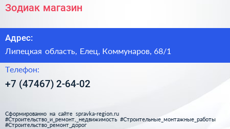 Зодиак, магазин по адресу Липецкая область, Елец, Коммунаров, 68/1 в дальнейшем Организация, размещена в следующих категориях: