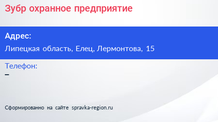 Зубр, охранное предприятие по адресу Липецкая область, Елец, Лермонтова, 15 в дальнейшем Организация, размещена в следующих категориях: