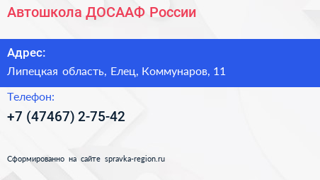 Автошкола, ДОСААФ России по адресу Липецкая область, Елец, Коммунаров, 11 в дальнейшем Организация, размещена в следующих категориях: