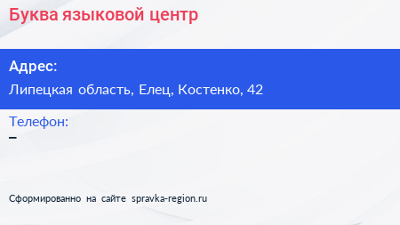 Буква, языковой центр по адресу Липецкая область, Елец, Костенко, 42 в дальнейшем Организация, размещена в следующих категориях: