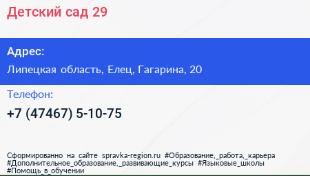 Детский сад №29 по адресу Липецкая область, Елец, Гагарина, 20 в дальнейшем Организация, размещена в следующих категориях: