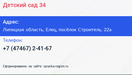 Детский сад №34 по адресу Липецкая область, Елец, посёлок Строитель, 22а в дальнейшем Организация, размещена в следующих категориях:
