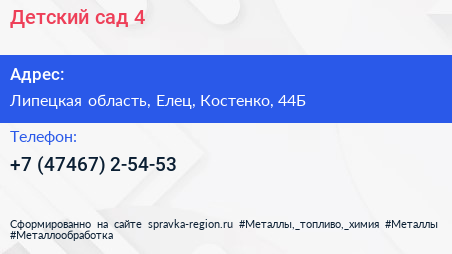 Детский сад №4 по адресу Липецкая область, Елец, Костенко, 44Б в дальнейшем Организация, размещена в следующих категориях: