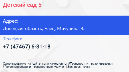 Детский сад №5 по адресу Липецкая область, Елец, Мичурина, 4а в дальнейшем Организация, размещена в следующих категориях: