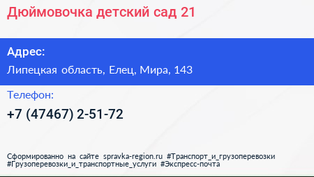 Дюймовочка, детский сад №21 по адресу Липецкая область, Елец, Мира, 143 в дальнейшем Организация, размещена в следующих категориях: