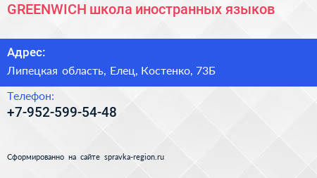 GREENWICH, школа иностранных языков по адресу Липецкая область, Елец, Костенко, 73Б в дальнейшем Организация, размещена в следующих категориях:
