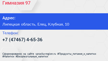 Гимназия №97 по адресу Липецкая область, Елец, Клубная, 10 в дальнейшем Организация, размещена в следующих категориях: