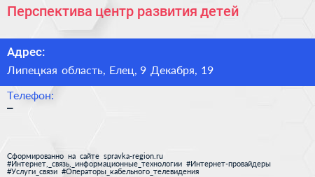 Перспектива, центр развития детей по адресу Липецкая область, Елец, 9 Декабря, 19 в дальнейшем Организация, размещена в следующих категориях: