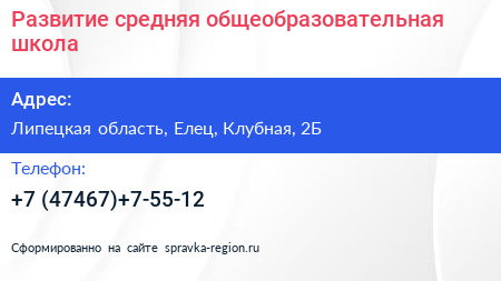 Развитие, средняя общеобразовательная школа по адресу Липецкая область, Елец, Клубная, 2Б в дальнейшем Организация, размещена в следующих категориях: