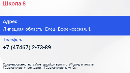 Школа №8 по адресу Липецкая область, Елец, Ефремовская, 1 в дальнейшем Организация, размещена в следующих категориях:
