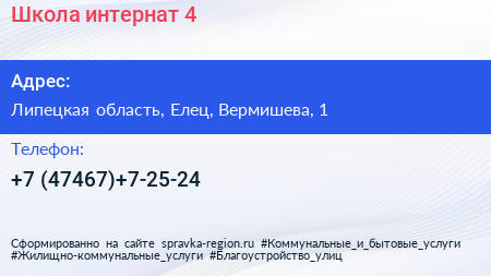 Школа-интернат №4 по адресу Липецкая область, Елец, Вермишева, 1 в дальнейшем Организация, размещена в следующих категориях: