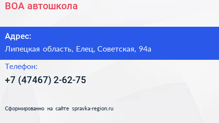 ВОА, автошкола по адресу Липецкая область, Елец, Советская, 94а в дальнейшем Организация, размещена в следующих категориях: