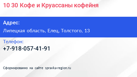 10.30 Кофе и Круассаны, кофейня по адресу Липецкая область, Елец, Толстого, 13 в дальнейшем Организация, размещена в следующих категориях: