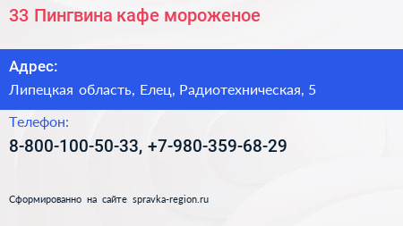 33 Пингвина, кафе-мороженое по адресу Липецкая область, Елец, Радиотехническая, 5 в дальнейшем Организация, размещена в следующих категориях: