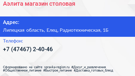 Аэлита, магазин-столовая по адресу Липецкая область, Елец, Радиотехническая, 1Б в дальнейшем Организация, размещена в следующих категориях: