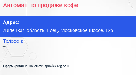 Автомат по продаже кофе по адресу Липецкая область, Елец, Московское шоссе, 12а в дальнейшем Организация, размещена в следующих категориях: