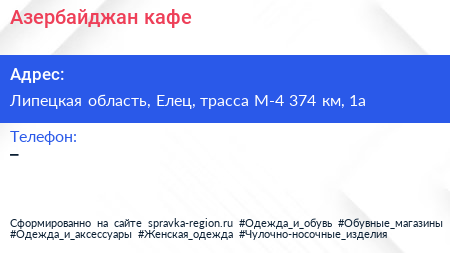 Азербайджан, кафе по адресу Липецкая область, Елец, трасса М-4 374 км, 1а в дальнейшем Организация, размещена в следующих категориях: