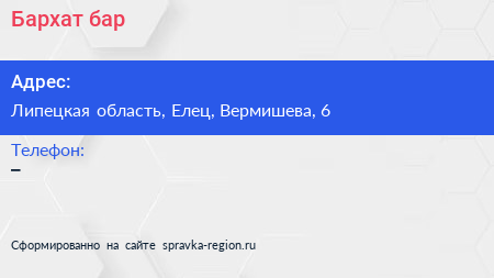 Бархат, бар по адресу Липецкая область, Елец, Вермишева, 6 в дальнейшем Организация, размещена в следующих категориях: