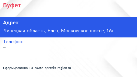 Буфет по адресу Липецкая область, Елец, Московское шоссе, 16г в дальнейшем Организация, размещена в следующих категориях: