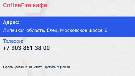 CoffeeFire, кафе по адресу Липецкая область, Елец, Московское шоссе, 6 в дальнейшем Организация, размещена в следующих категориях: