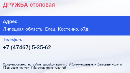 ДРУЖБА, столовая по адресу Липецкая область, Елец, Костенко, 67д в дальнейшем Организация, размещена в следующих категориях: