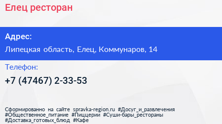 Елец, ресторан по адресу Липецкая область, Елец, Коммунаров, 14 в дальнейшем Организация, размещена в следующих категориях:
