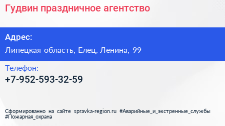 Гудвин, праздничное агентство по адресу Липецкая область, Елец, Ленина, 99 в дальнейшем Организация, размещена в следующих категориях: