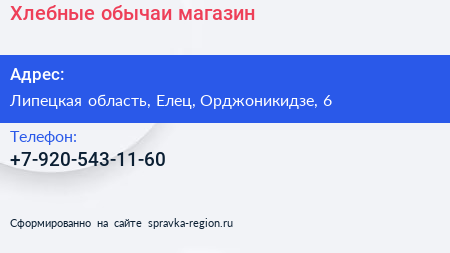 Хлебные обычаи, магазин по адресу Липецкая область, Елец, Орджоникидзе, 6 в дальнейшем Организация, размещена в следующих категориях: