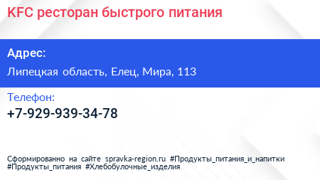 KFC, ресторан быстрого питания по адресу Липецкая область, Елец, Мира, 113 в дальнейшем Организация, размещена в следующих категориях: