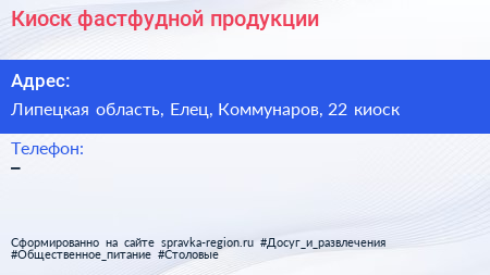 Киоск фастфудной продукции по адресу Липецкая область, Елец, Коммунаров, 22 киоск в дальнейшем Организация, размещена в следующих категориях: