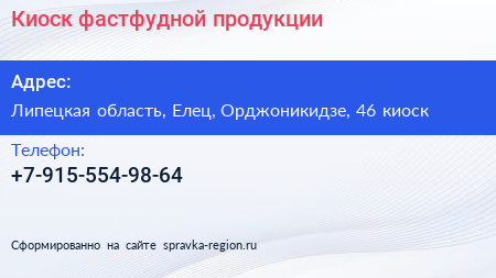 Киоск фастфудной продукции по адресу Липецкая область, Елец, Орджоникидзе, 46 киоск в дальнейшем Организация, размещена в следующих категориях: