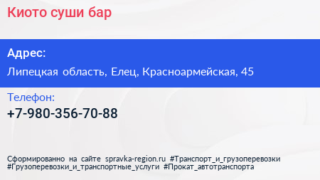 Киото, суши-бар по адресу Липецкая область, Елец, Красноармейская, 45 в дальнейшем Организация, размещена в следующих категориях: