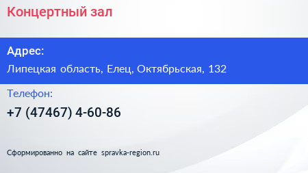 Концертный зал по адресу Липецкая область, Елец, Октябрьская, 132 в дальнейшем Организация, размещена в следующих категориях:
