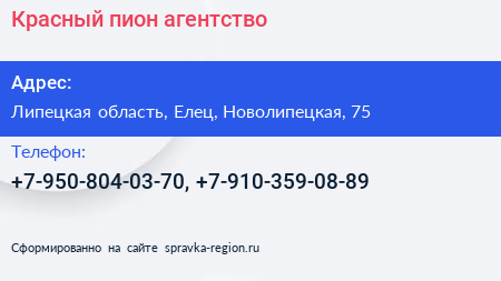 Красный пион, агентство по адресу Липецкая область, Елец, Новолипецкая, 75 в дальнейшем Организация, размещена в следующих категориях: