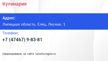 Кулинария по адресу Липецкая область, Елец, Лесная, 1 в дальнейшем Организация, размещена в следующих категориях: