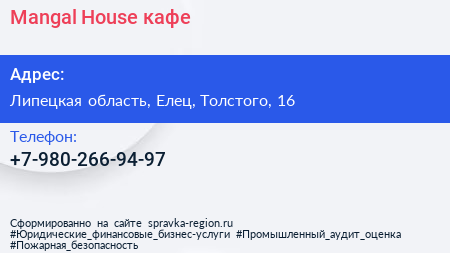 Mangal House, кафе по адресу Липецкая область, Елец, Толстого, 16 в дальнейшем Организация, размещена в следующих категориях: