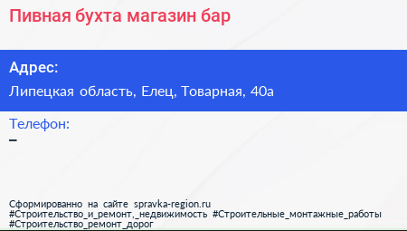 Пивная бухта, магазин-бар по адресу Липецкая область, Елец, Товарная, 40а в дальнейшем Организация, размещена в следующих категориях: