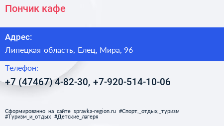 Пончик, кафе по адресу Липецкая область, Елец, Мира, 96 в дальнейшем Организация, размещена в следующих категориях: