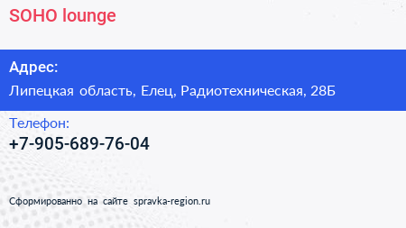 SOHO lounge по адресу Липецкая область, Елец, Радиотехническая, 28Б в дальнейшем Организация, размещена в следующих категориях: