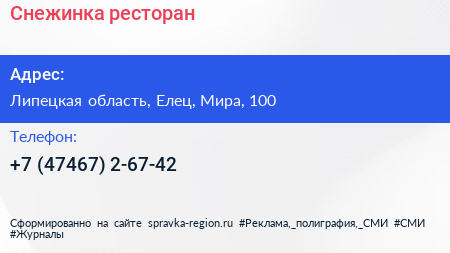 Снежинка, ресторан по адресу Липецкая область, Елец, Мира, 100 в дальнейшем Организация, размещена в следующих категориях: