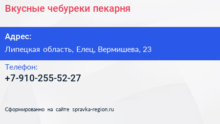 Вкусные чебуреки, пекарня по адресу Липецкая область, Елец, Вермишева, 23 в дальнейшем Организация, размещена в следующих категориях: